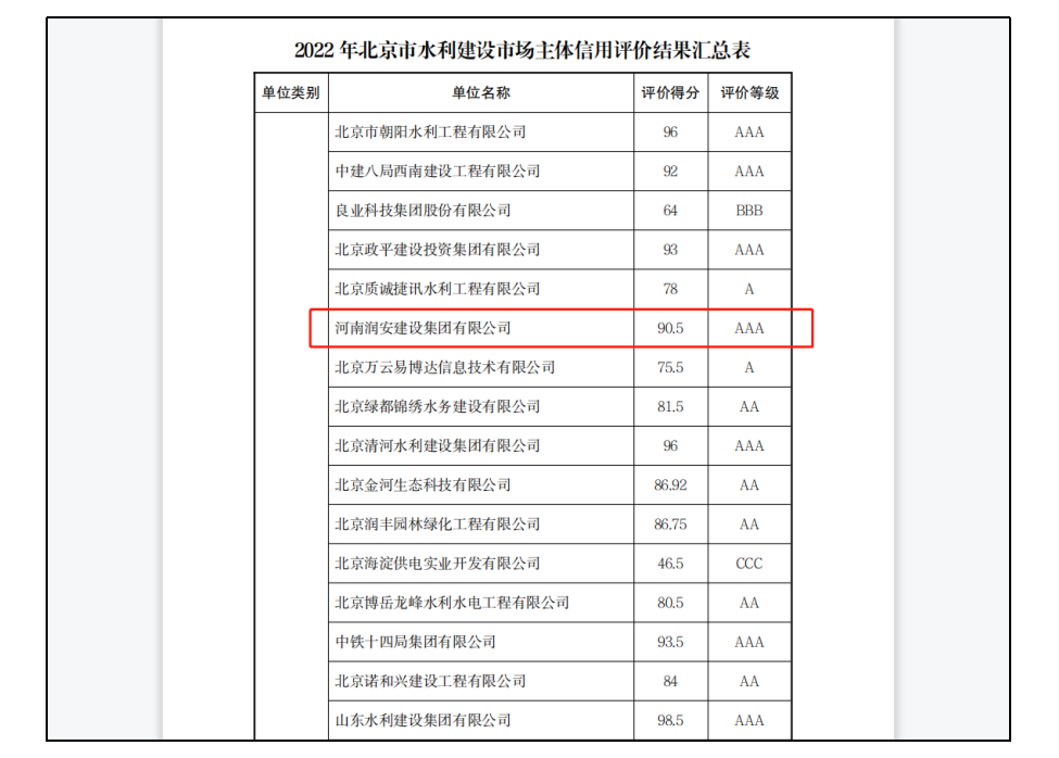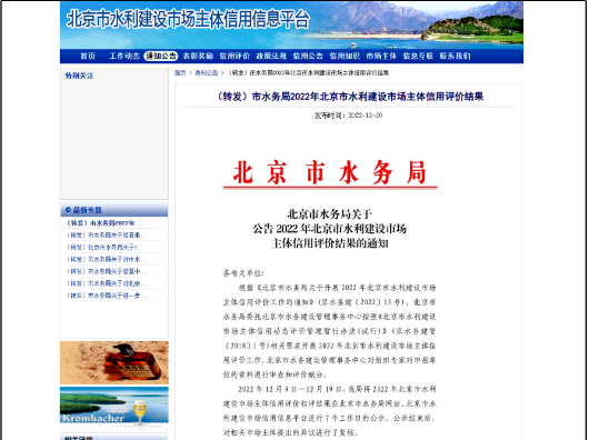 2022年12月22日,北京市水務(wù)局發(fā)布關(guān)于公告2022年北京市水利建設(shè)市場主體信用評(píng)價(jià)結(jié)果的通知,集團(tuán)公司以90.5的高分通過了此次評(píng)價(jià),獲得了高等級(jí)AAA級(jí)信用評(píng)價(jià),為集團(tuán)公司開拓水利業(yè)務(wù)打下了良好的基礎(chǔ)。